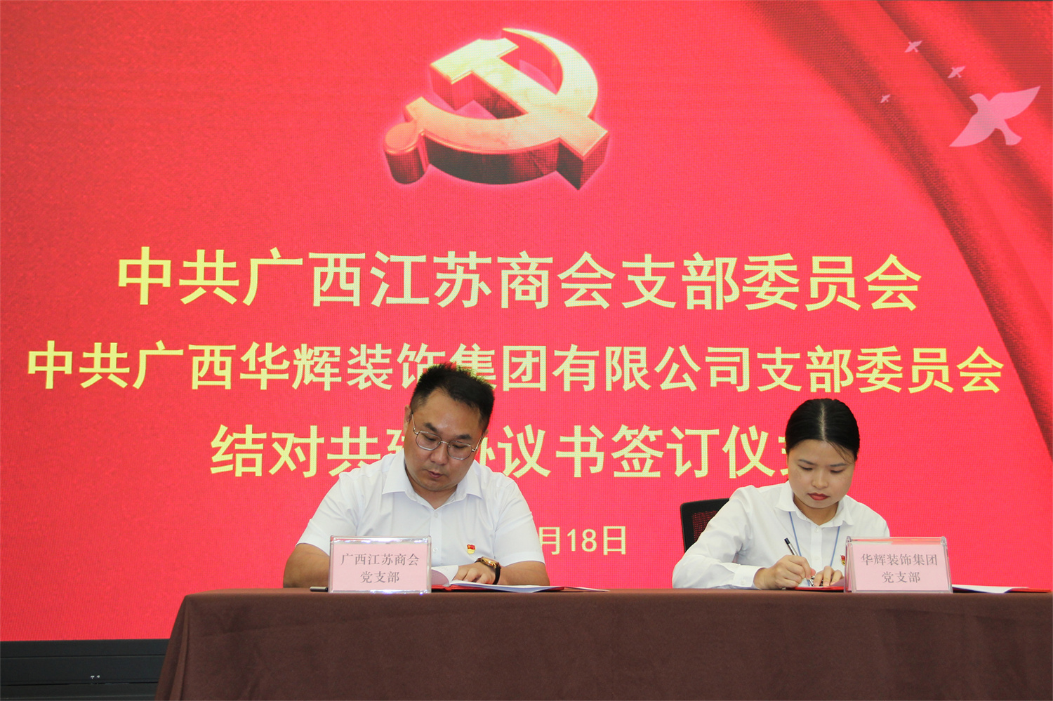 簽約儀式上,商會(huì)黨支部書記王偉、華輝裝飾集團(tuán)黨支部書記劉萍東簽訂了結(jié)對(duì)共建協(xié)議,并由王偉同志代表廣西江蘇商會(huì)黨支部向廣西華輝裝飾集團(tuán)有限公司黨支部贈(zèng)牌。