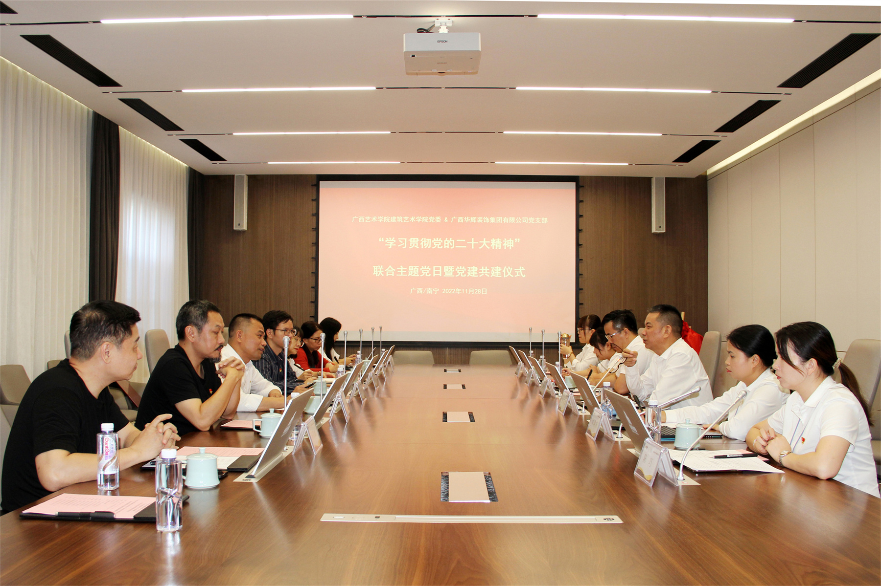 2022年11月28日,廣西藝術(shù)學(xué)院建筑藝術(shù)學(xué)院黨委與廣西華輝裝飾集團(tuán)有限公司黨支部,開(kāi)展“學(xué)習(xí)貫徹黨的二十大精神”聯(lián)合主題黨日暨黨建共建儀式;同時(shí),廣西藝術(shù)學(xué)院建筑藝術(shù)學(xué)院與廣西華輝裝飾集團(tuán)有限公司,舉行了“聯(lián)合共建校外實(shí)踐教育基地”揭牌儀式。