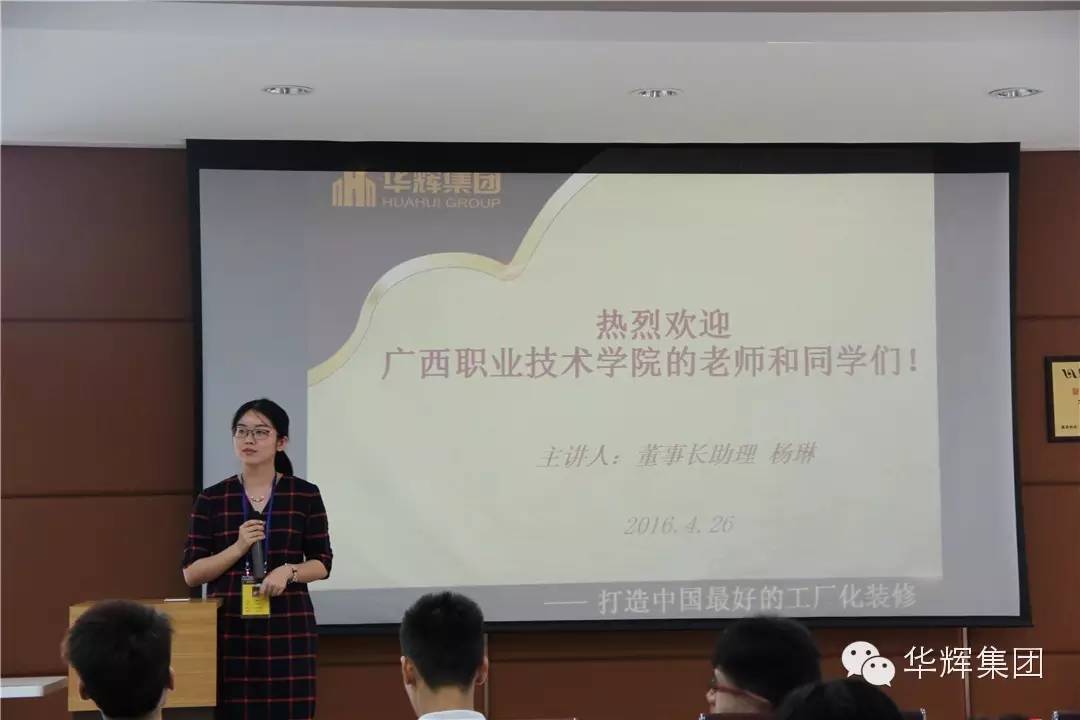華輝集團董事長助理首先對廣西職業(yè)技術(shù)學院師生的到來表示熱烈歡迎,同時也表示歡迎更多的優(yōu)秀畢業(yè)生選擇到公司工作。隨后觀看了公司宣傳片,初步了解公司發(fā)展歷程、業(yè)務覆蓋、榮譽資質(zhì)、工程案例和人文風采。對于華輝集團的跨越發(fā)展、蓬勃現(xiàn)狀和美好前景,來訪師生紛紛表示贊嘆。