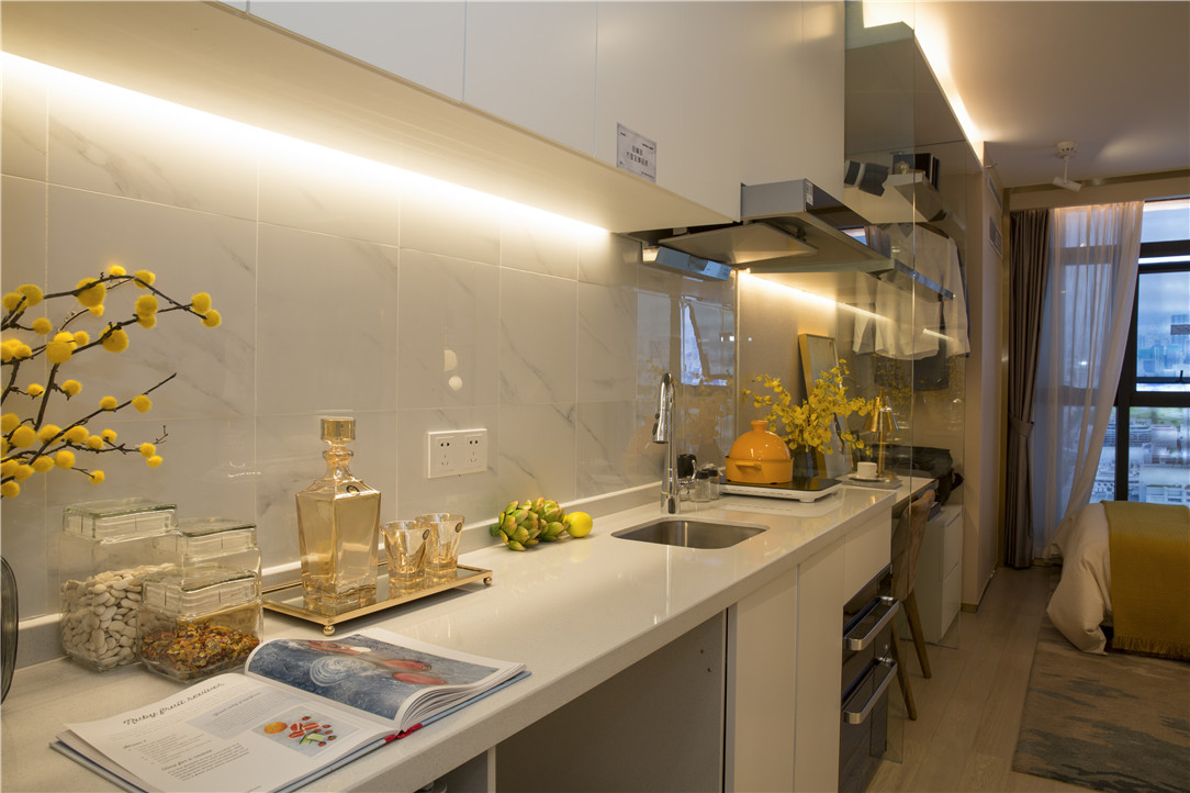 ▲開(kāi)放式廚房設(shè)計(jì),玄關(guān)與明廚、小客廳連成一線,一字型櫥柜簡(jiǎn)潔實(shí)用,將擁擠雜亂擠出門(mén)外,整體視覺(jué)上舒適大氣。