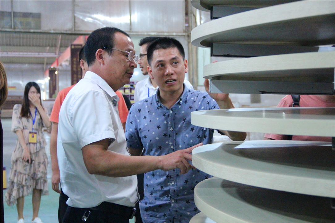 ▲袁繼秋董事長向華輝工藝主任時世義了解生產工藝