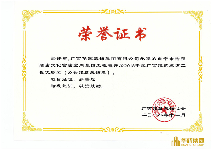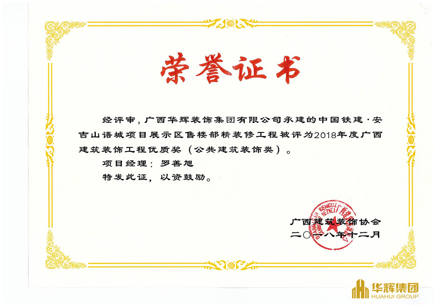 ▲華輝承建的中國鐵建·安吉山語城項目展示區(qū)售樓部精裝修工程、南寧市怡程酒店文化宮店室內(nèi)裝飾工程榮獲“2018年度廣西建筑裝飾工程優(yōu)質(zhì)獎(公共建筑裝飾類)