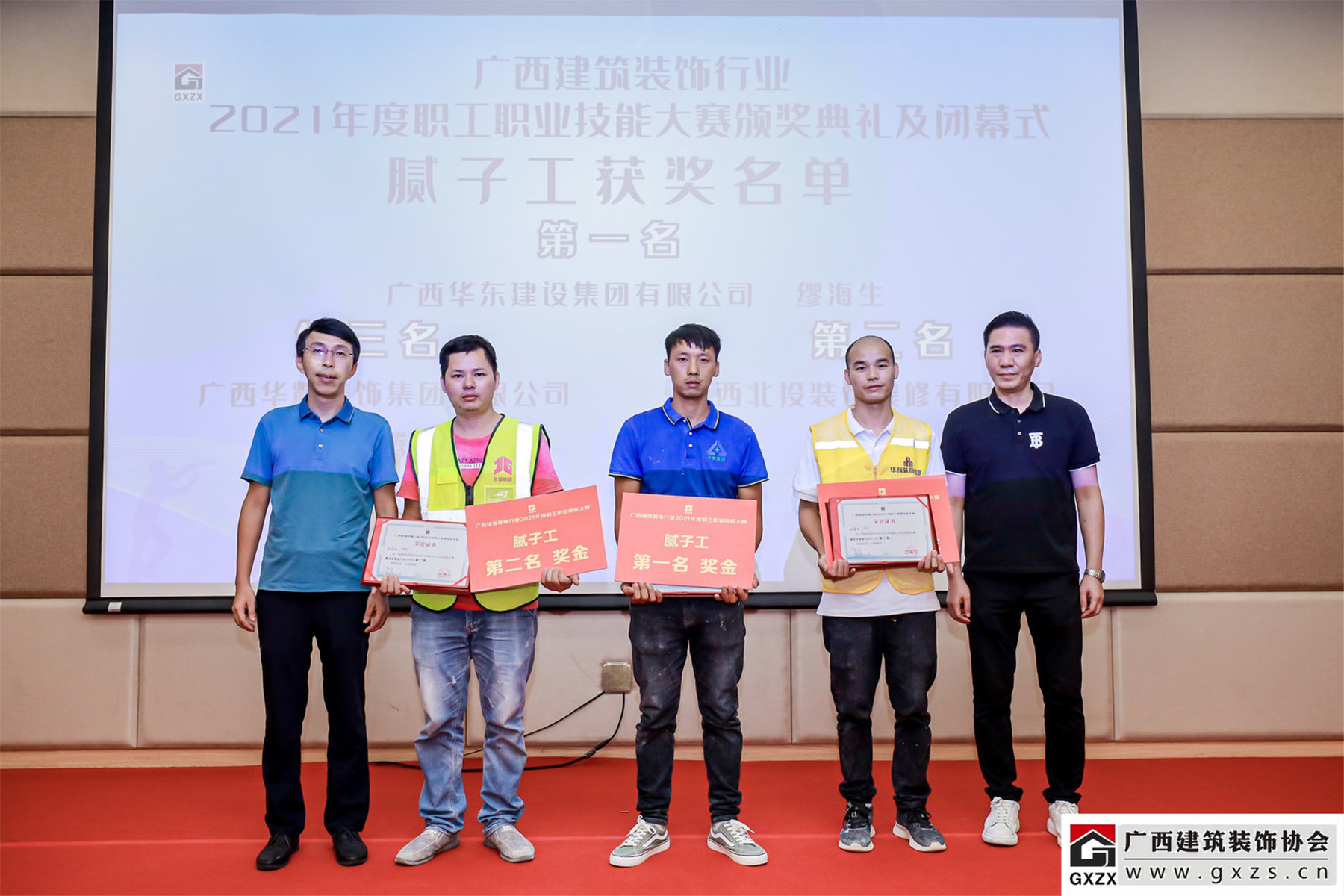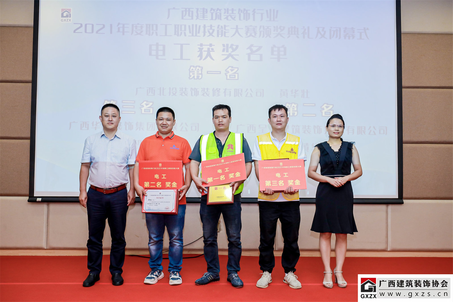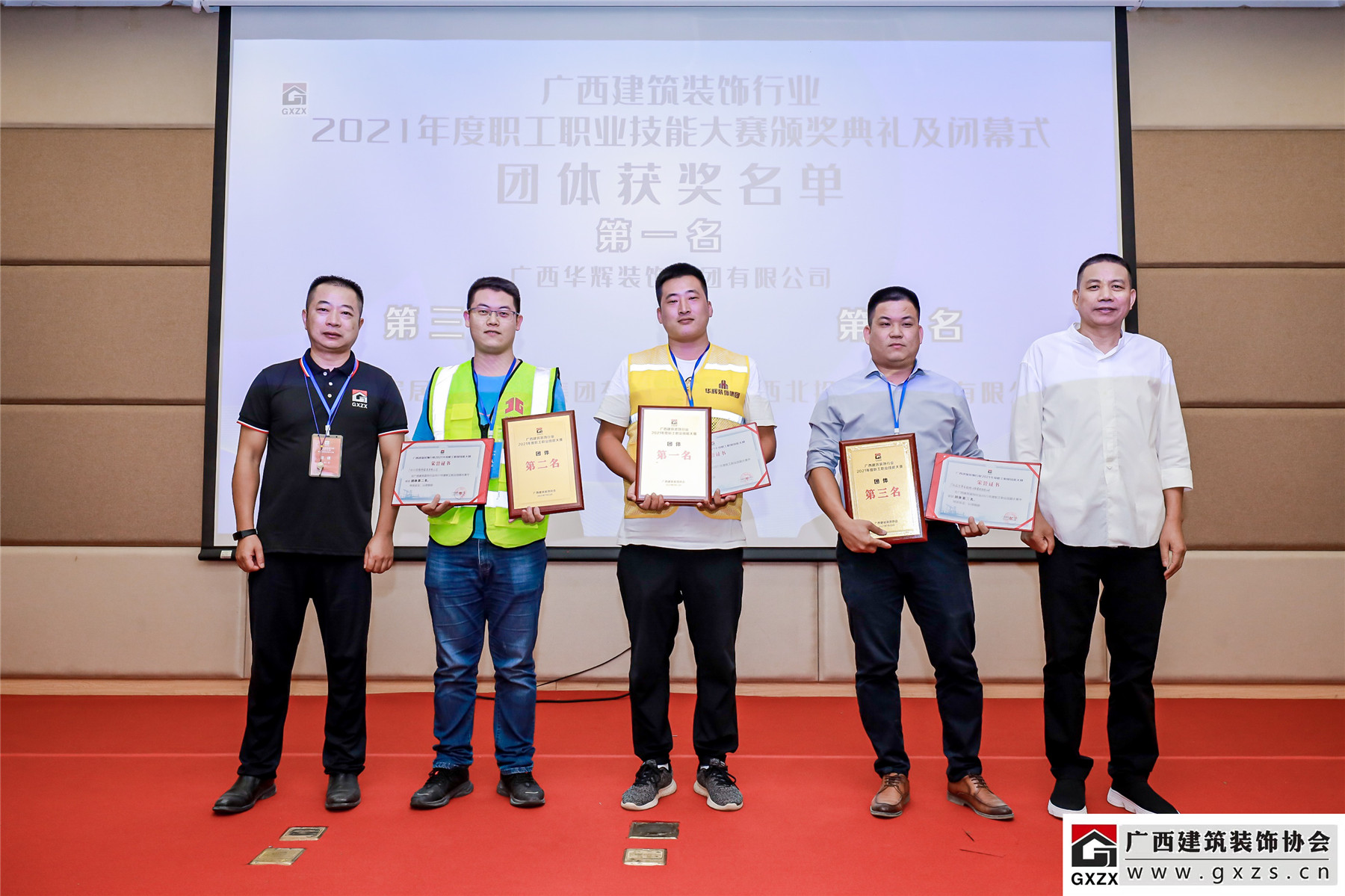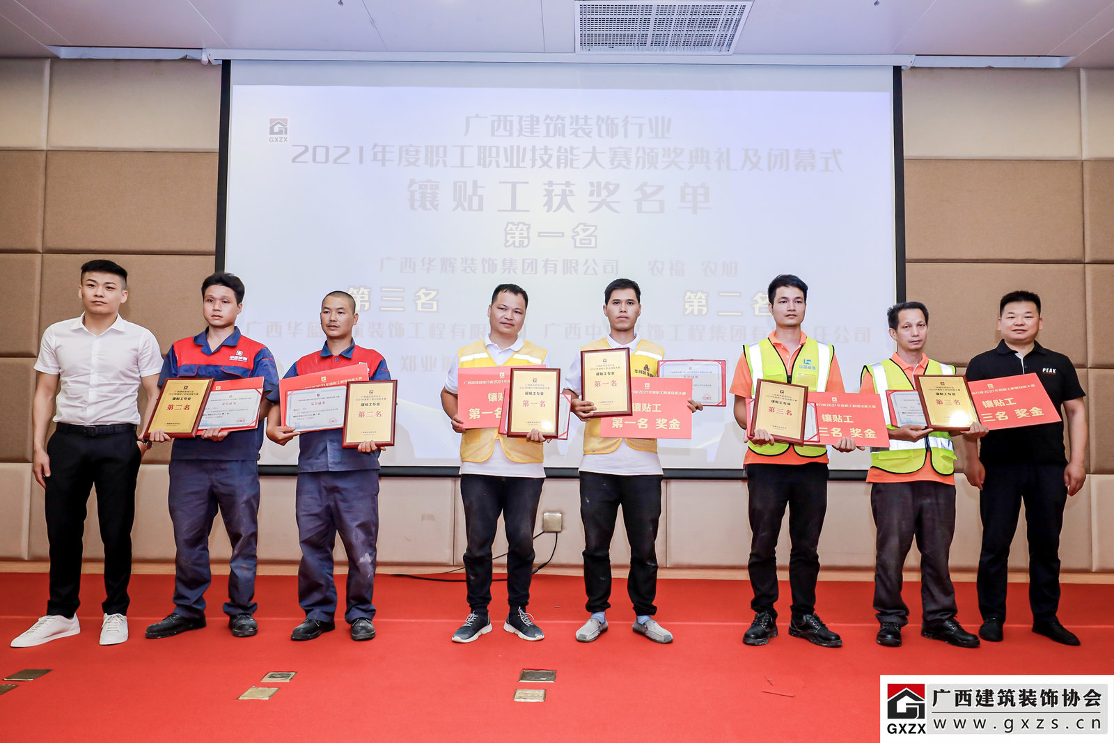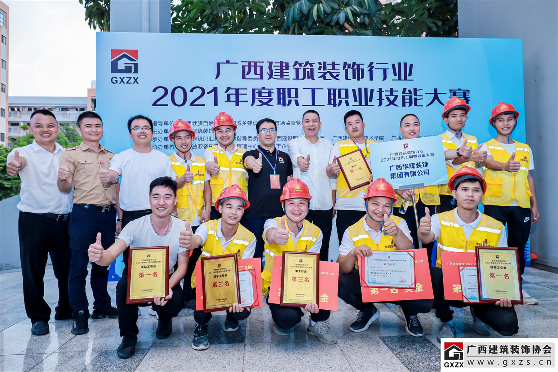 2021年7月23日,廣西建筑裝飾行業(yè)2021年度職工職業(yè)技能大賽在廣西建設(shè)職業(yè)技術(shù)學(xué)院舉行。華輝參賽選手榮獲團(tuán)體第一名且綜合評(píng)分滿分100分、鑲貼工第一名、電工第三名、膩?zhàn)庸さ谌暮贸煽?jī)。