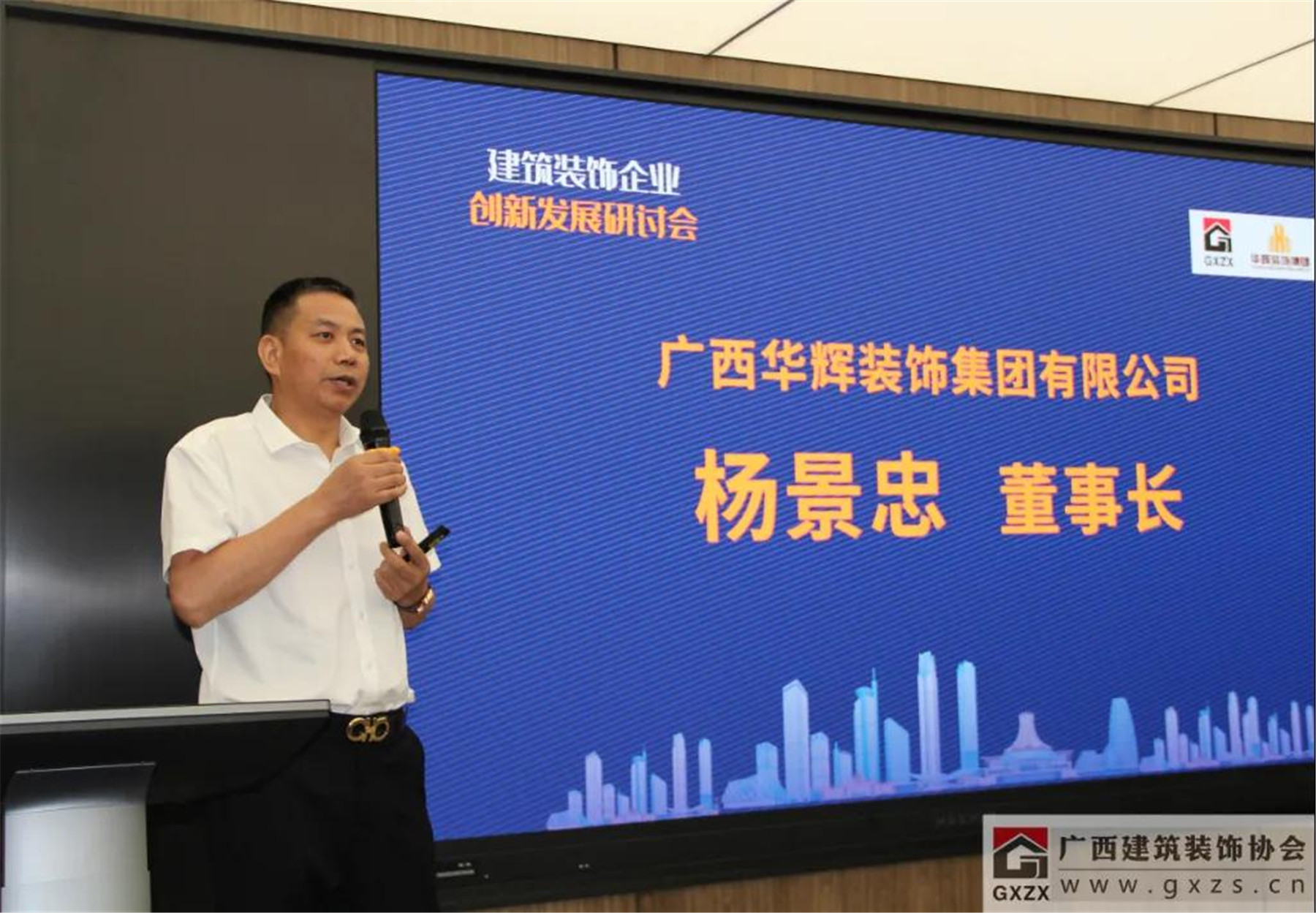 協(xié)會(huì)副會(huì)長(zhǎng)、廣西華輝裝飾集團(tuán)有限公司董事長(zhǎng)楊景忠在會(huì)上分享了“三駕馬車(chē)驅(qū)動(dòng)華輝轉(zhuǎn)型升級(jí)”的重要作用。