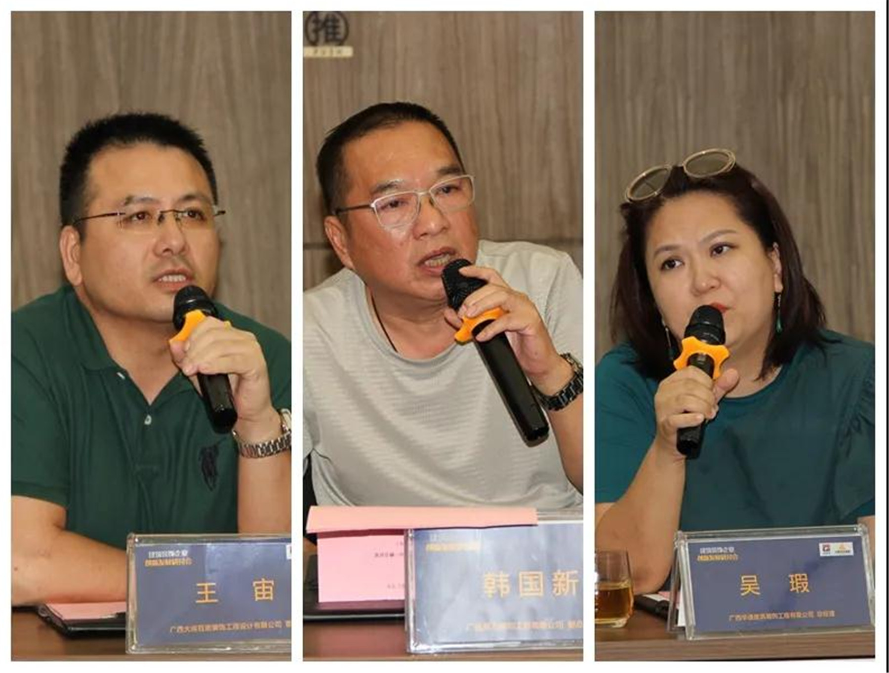 ▲(左)廣西大將百諾裝飾工程設(shè)計(jì)有限公司董事長(zhǎng) 王宙,(中)廣西晟力裝飾工程有限公司副總經(jīng)理 韓國(guó)新,(右)廣西華通建筑裝飾工程有限公司總經(jīng)理 吳瑕