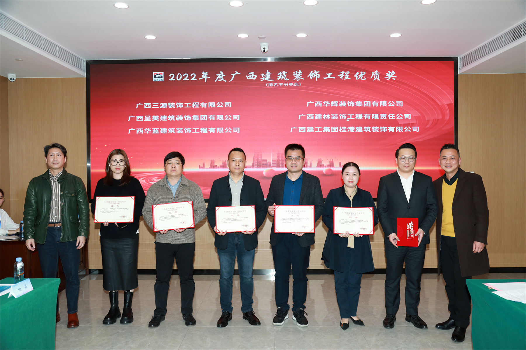 會議宣讀并表彰了“2022年廣西建筑裝飾工程優(yōu)質(zhì)獎(廣西建筑裝飾工程最高質(zhì)量獎)”獲獎項目,華輝集團四個項目榮獲表彰,分別為:廣西社區(qū)養(yǎng)老示范中心裝修工程設(shè)計施工總承包項目,金城廣場一期工程,廣西北部灣銀行五象總部大廈非標準層裝修項目,盛天西城希爾頓歡朋酒店客房、公共區(qū)域裝飾裝修工程。