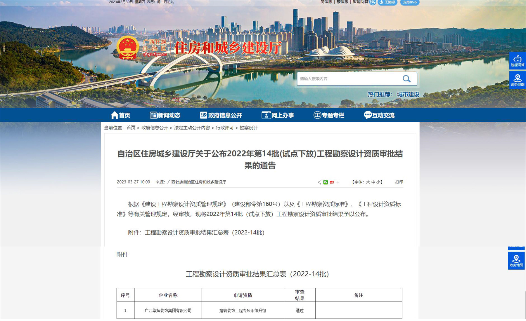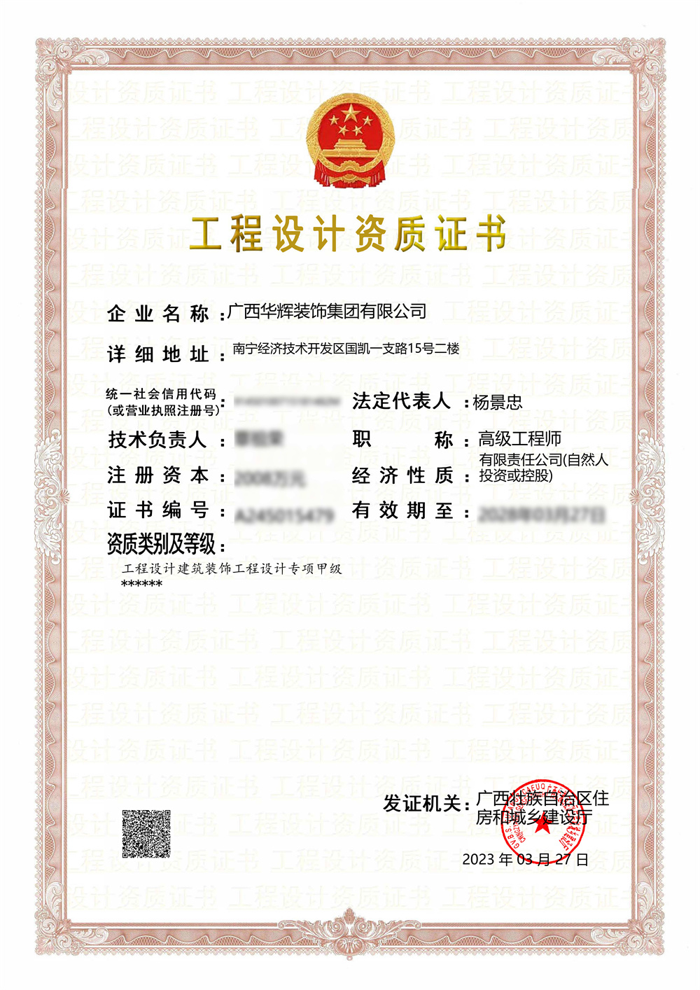 2023年3月27日,經(jīng)廣西壯族自治區(qū)住房和城鄉(xiāng)建設(shè)廳批準(zhǔn),華輝裝飾集團(tuán)的建筑裝飾工程設(shè)計(jì)專項(xiàng)資質(zhì)成功榮升為甲級(jí),這是建筑裝飾工程設(shè)計(jì)專項(xiàng)的最高資質(zhì),至此,華輝擁有設(shè)計(jì)施工“雙甲”資質(zhì)。