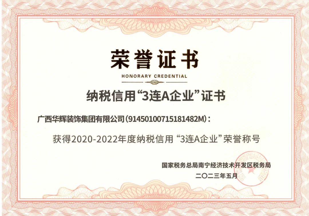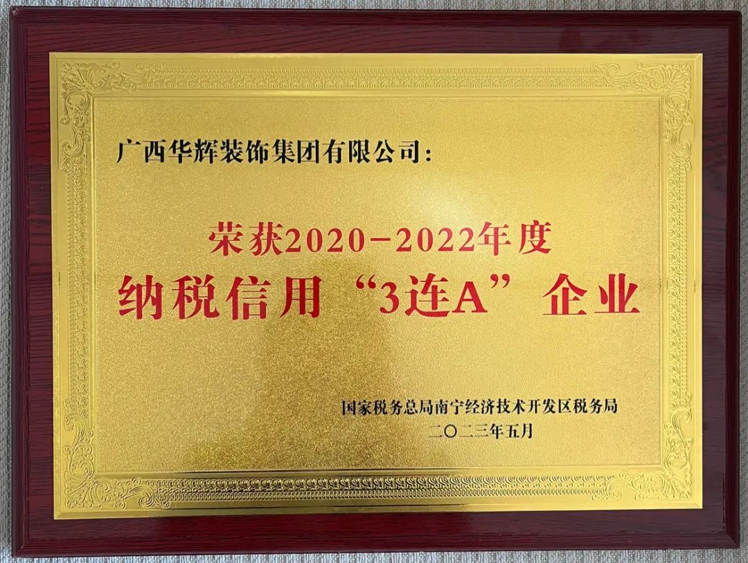 近日,廣西華輝裝飾集團(tuán)憑借良好的納稅信譽(yù),獲得國(guó)家稅務(wù)總局南寧經(jīng)濟(jì)技術(shù)開(kāi)發(fā)區(qū)稅務(wù)局2020-2022年度納稅信用“3連A企業(yè)”榮譽(yù)稱號(hào)。