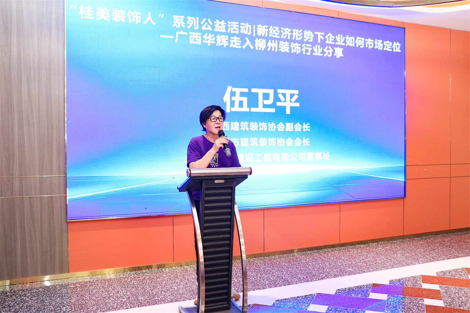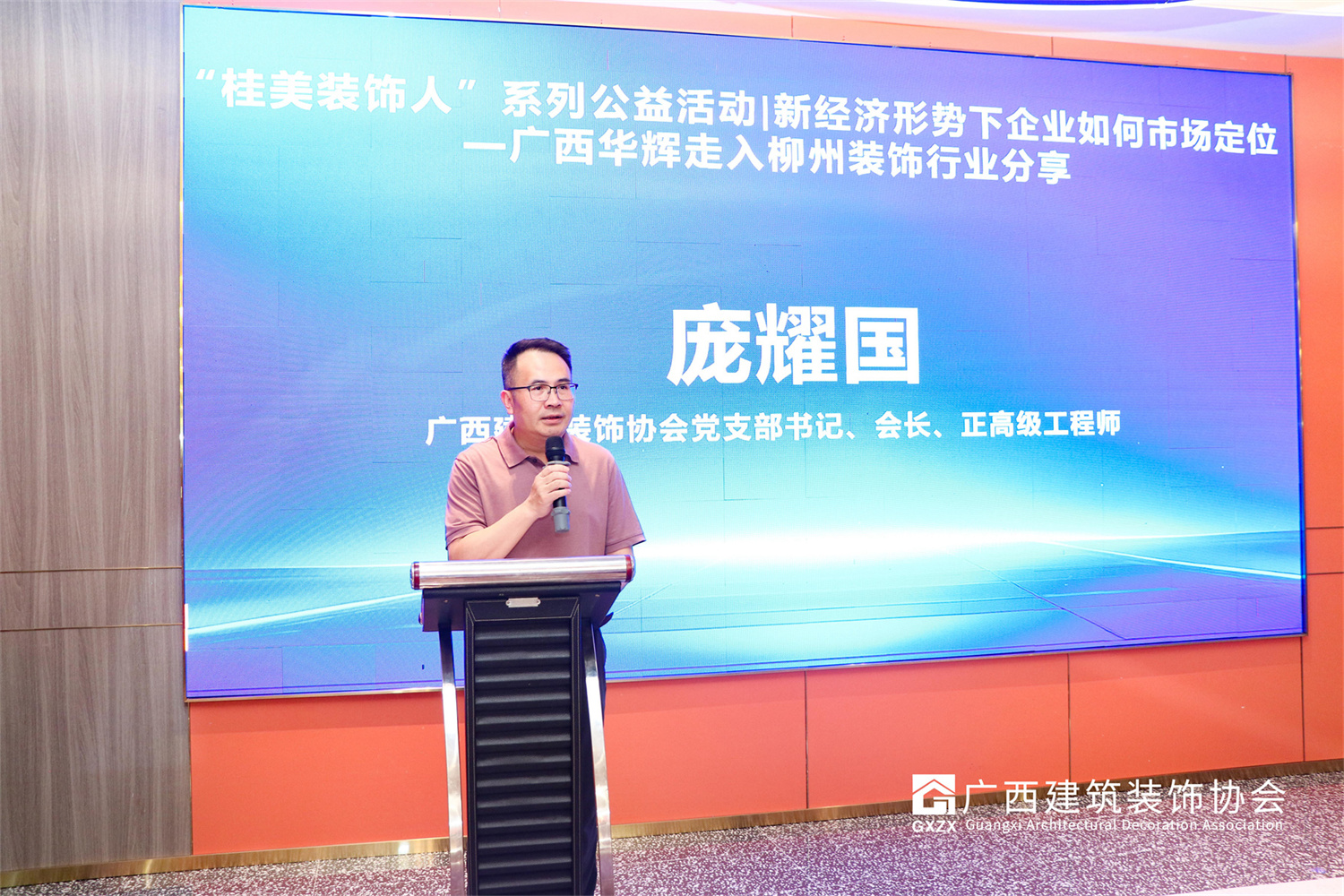 廣西建筑裝飾協(xié)會會長龐耀國在致辭中,首先對柳州建筑裝飾協(xié)會、廣西華輝裝飾集團有限公司精心配合組織本次活動表示感謝,并向到場的各位柳州市行業(yè)同仁致以誠摯問候。他指出,近年來,廣西建筑裝飾行業(yè)在綠色低碳材料應(yīng)用、裝配式施工推廣,以及數(shù)字化管理與智能化設(shè)計等領(lǐng)域,呈現(xiàn)出加快轉(zhuǎn)型升級的趨勢。他強調(diào),面對當前經(jīng)濟環(huán)境變化和市場競爭加劇,企業(yè)必須準確把握自身定位,提升核心競爭力。